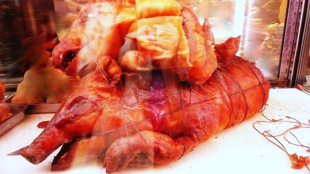 I’ll try anything twice but this time just the once will do fine. Porchetta is one of those authentic specialities of la cuisine niçoise I would have loved to love but it just aint gonna happen. We’d been gazing in awed fear and longing for far too long at the petrifying porcine carcasses in their glass coffins outside the charcuterie shops along rue Pairolière in Vieux Nice; now was the time to bite the bullet and actually buy a slice. Thank heavens Madame at Charcuterie Ghibaudo was kind enough to offer a demi-tranche as this stuff is not cheap at near-enough €20 a kilo. As it was, our package weighed a good 400g.