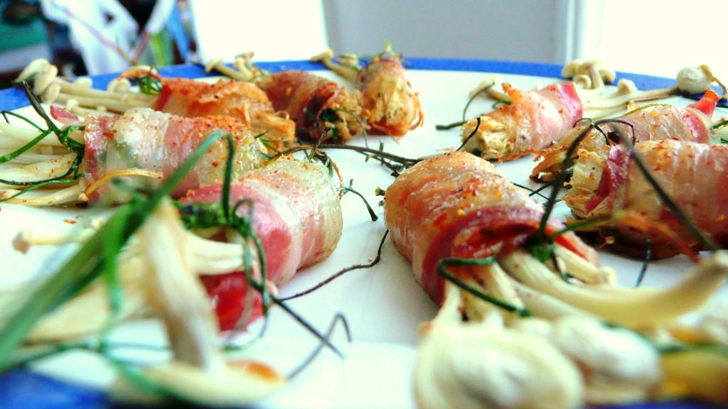 I used the method for rotolini – or involtini – and wrapped a few enoki with chives in half-slices of pancetta and baked them for about 15 minutes at Gas 4-ish (375F, 190C, moderate-to-hot) to crisp: simple, genius!