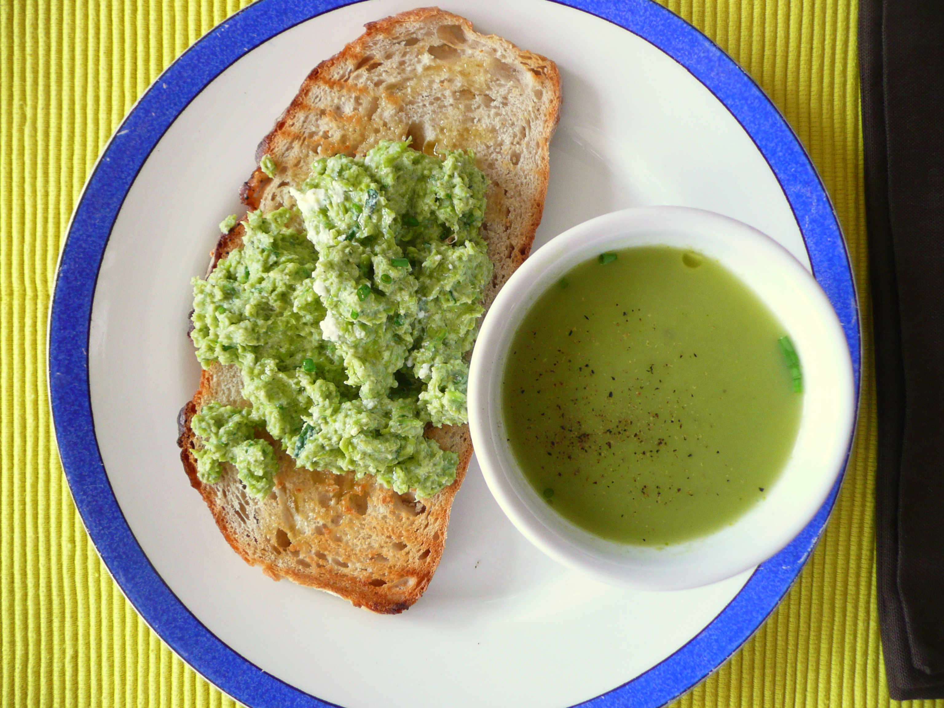 pea, lettuce & lovage soup with pea & ricotta bruschetta