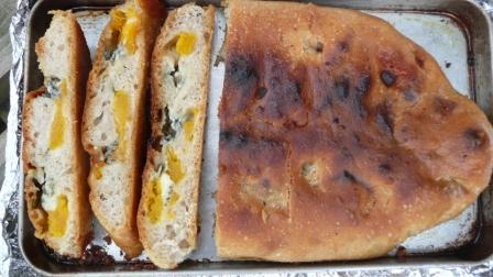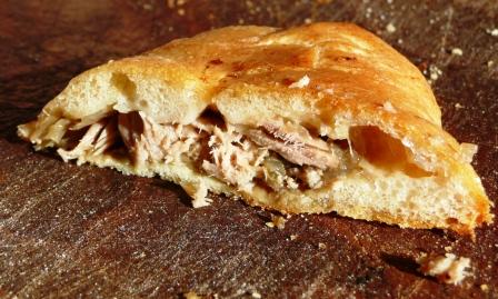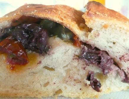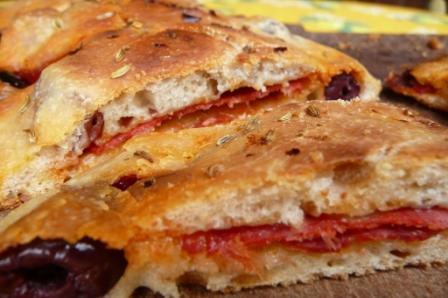This stuffed bread makes wonderful picnic food as the filling holds itself in place allowing you to eat it with just hands – and a napkin for the fastidious. We took it for a packed lunch while decorating our new apartment and it was much more sustaining than the bag of Doritos (T’s choice, not mine) we’d munched on the day before: it didn’t stain everything orange either, which is a bit of a bonus when you’re trying to paint everything in shades of white.