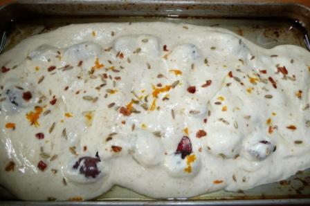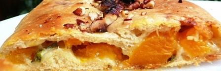 Strew the cheese and squash over the surface of the dough, padding the filling towards the edges. Scatter with the shredded sage, then make a papoose by bringing the long edges of the dough to meet over the top and press them together to seal so the cheese doesn’t leak out when it melts in the oven. At this point it will not look at all promising, but have no fear. Sprinkle chopped nuts, if using, across the seam and press them lightly into the dough so they stick.