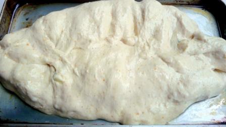 Gently stretch out the ball of dough on an oiled swiss roll tin – or toaster oven tray – coaxing it towards the edges. It will relax and stretch further so don’t be anxious about this.