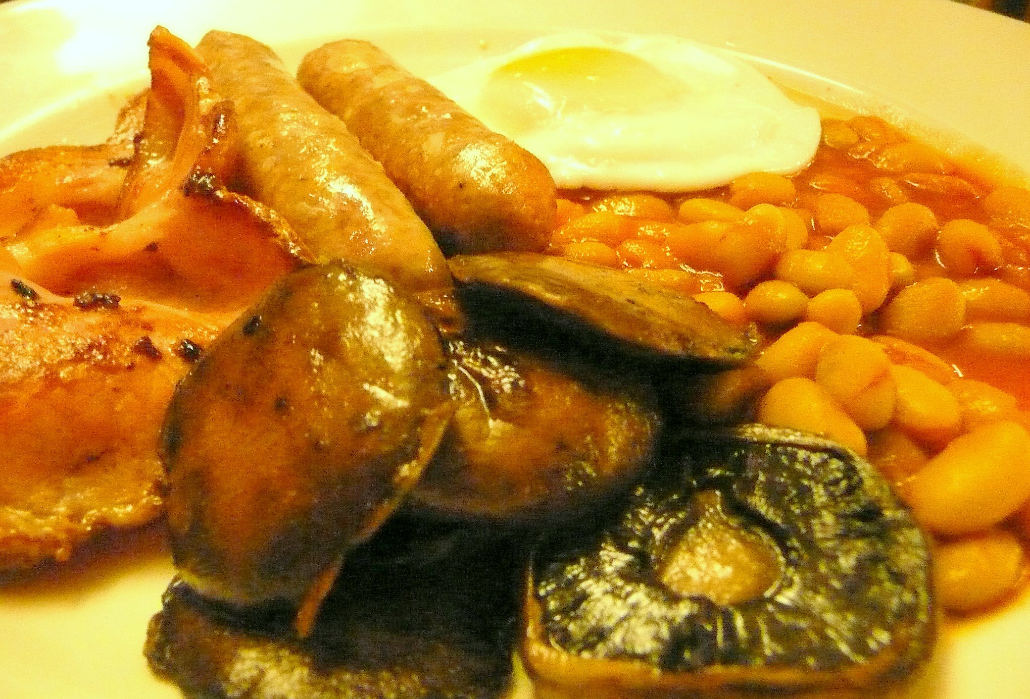 - bacon, fried duck egg, sausages, mushrooms & flageolet beans in tomato sauce