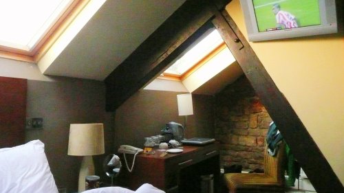As part of my position I am required to attend top-secret conferences scattered around the countryside: this one in Lancaster, which is about as far as you can go without running into the Lake District. The journey should have taken five hours but it took nine, of which four were spent in such mind-numbingly boring stop-start M6 motorway traffic that we only have the knowledge of time having passed: either that or we were abducted by aliens, but I don’t recall any little green men probing my anus. We finally reached the Sun hotel in the heart of downtown old town Lancaster at 9 pm, its integral bar abuzz with Friday night revellers: once T had macheted his way through the crowd to the reception area at the back we were led up several carpeted flights of stairs to Executive Room 32. After the long drive flat screen satellite TV, wine glasses and corkscrew were almost all we needed and after a quick trip down to the bar to pick up a bottle of Rioja we settled happily into our comfortable, cosy eyrie under the eaves.