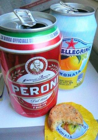My delight had much to do with having sourced our train ride snack from the countertop cornucopia of Carluccio’s caffè. A can of San Pellegrino Limonata for me: sharp, tart and truly lemony; very grown up and tasting nothing like pop, and a tinny of Peroni birra for he. Mine came with a foil cover to keep the sipping hole clean, which doubled up nicely as a micro-plate for our delectable little savoury biscuits: one each of parmesan/herb and walnut/rosemary flavours. Mmm – crisp and crumbly with the quality of their ingredients resonating on the palate: not much more than a morsel per piece yet intensely satisfying.